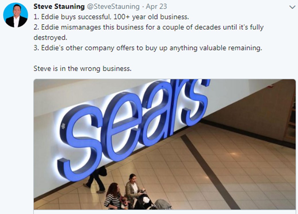 Lampert continúa insistiendo en que la compañía pronto volverá a ser rentable, a pesar de que el año pasado la compañía admitió que existen ”dudas sustanciales” sobre su capacidad para continuar en el negocio. El siguiente paso es esperar a que Sears responda a la oferta de compra, aunque es muy poco probable que la rechace.