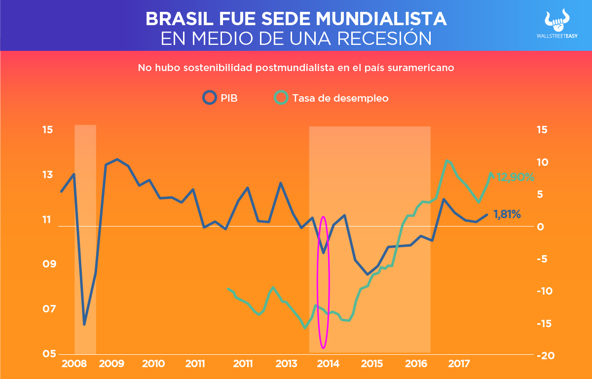 El país suramericano recibió el Mundial en medio de una recesión, con caída del PIB antes del evento, y nunca recuperó el crecimiento que traía un tiempo atrás. Al finalizar la cita, el desempleo se incrementó, por lo que los efectos tampoco fueron sostenibles.
