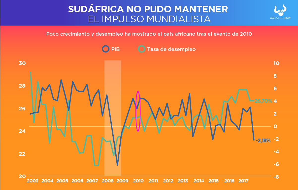 No todas son buenas noticias para los países anfitriones. En el caso de Sudáfrica, en 2010, se vio una ligera mejoría antes y después del Mundial, pero más por el efecto de la salida de la crisis financiera global de 2008.