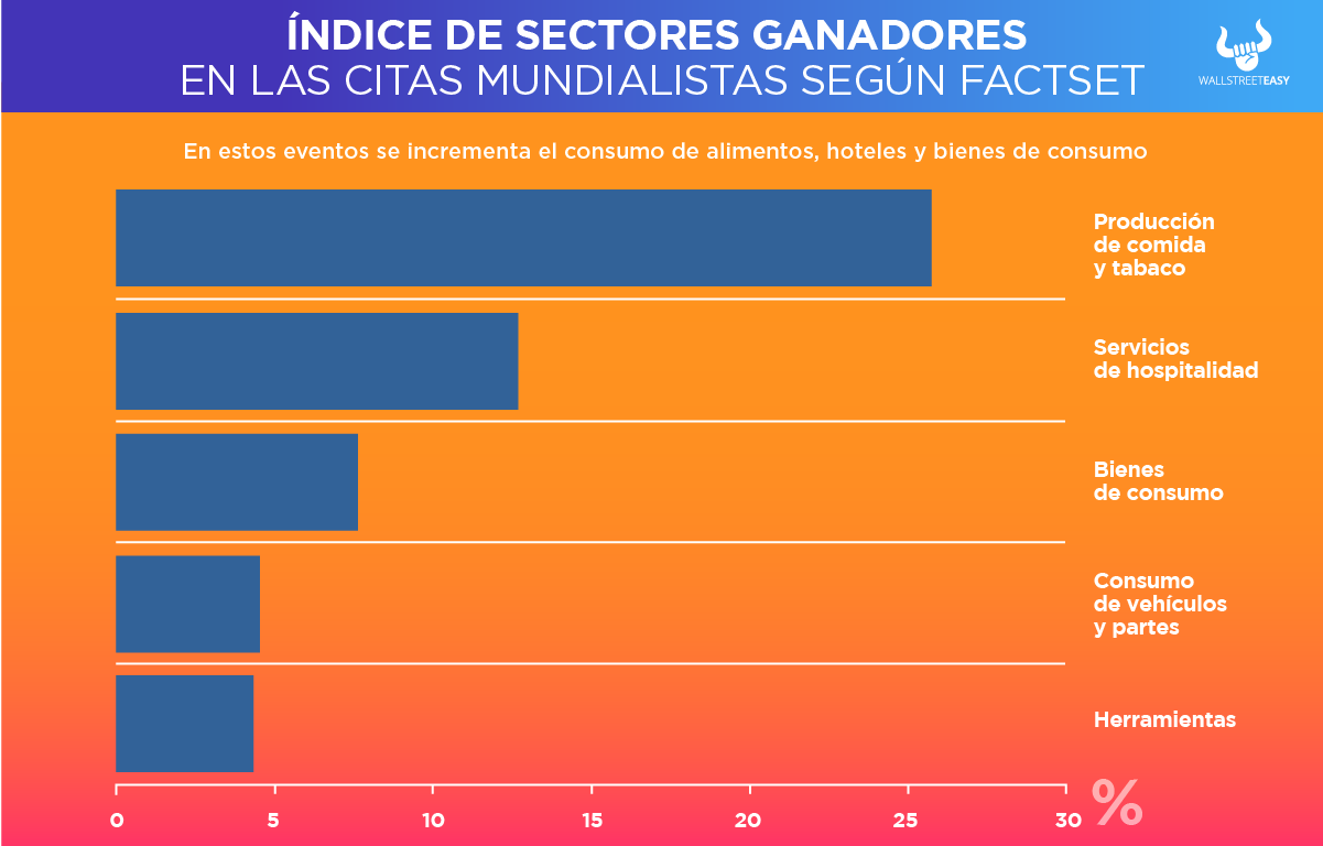Una Copa Mundial de Fútbol atrae a cientos de empresas. Los sectores que se ven más favorecidos en estos eventos fueron identificados por la consultora Factset. Destacan comida y tabaco, hoteles y servicios, productos del hogar, partes de vehículos y artículos de ferretería como los verdaderos ganadores en las citas mundialistas.