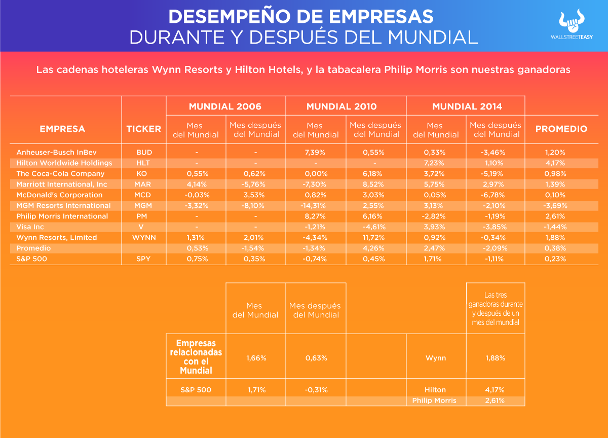 Entre las empresas realmente goleadoras durante esta gran cita tenemos a las cadenas hoteleras Wynn Resorts (WYNN) y Hilton Hotels (HLT), y la tabacalera Philip Morris (PM).