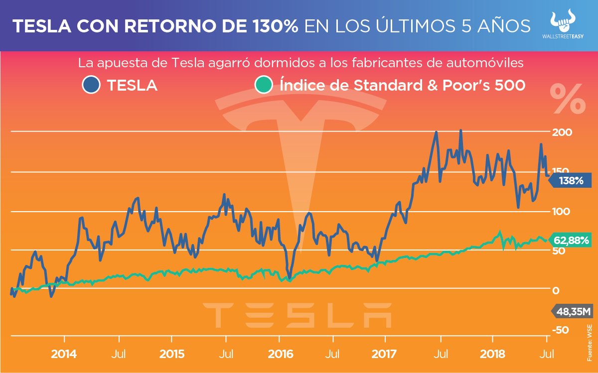 Elon Musk, CEO de Tesla, fue un visionario al apostar por los vehículos eléctricos y agarró a los grandes fabricantes de autos un poco dormidos al volante. Su apuesta le ha hecho obtener un retorno de 130% contra 60% del mercado en los últimos cinco años.