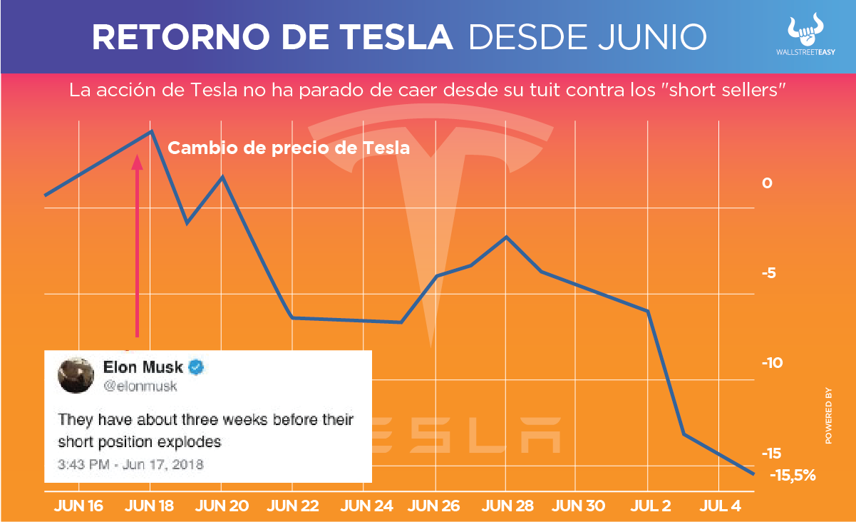 El mercado anticipaba el cumplimiento de la meta de producción desde hace tres semanas, cuando Musk, en un mensaje de Twitter, lo confirmaba mientras acusaba a los shorts sellers de apostar contra la empresa, lo que tuvo un efecto temporal sobre las acciones. Sin embargo, los papeles de Tesla no han parado de caer, y Wall Street continúa cuestionando que pueda mantener su producción actual.