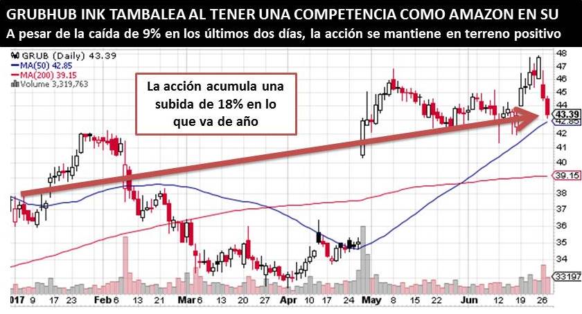 Fue solo un rumor que hizo llegar a la acción de GRUB a máximos históricos la semana pasada. Después de la compra de Whole Foods Market, Amazon parece tener un mayor potencial para llegar a los clientes que puede complicarle el panorama a GrubHub.