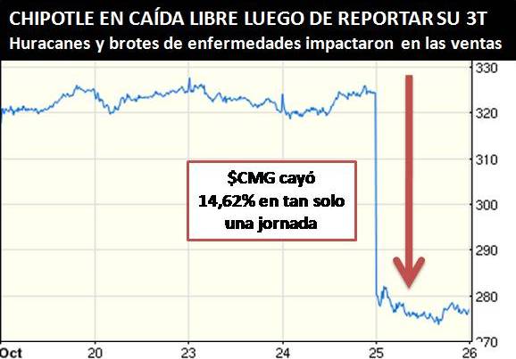 El miércoles 25 de octubre las acciones de la cadena de comida mexicana Chipotle (CMG) se derrumbaron (–14,62%) tras no alcanzar las expectativas en su informe del 3T.