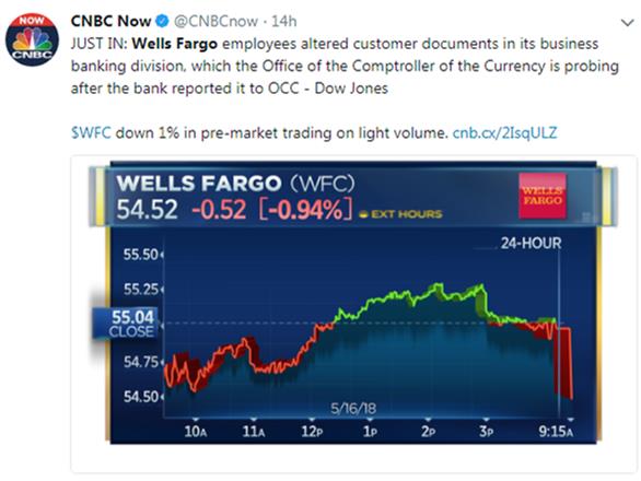 Durante la jornada de ayer, 17 de mayo, las acciones de Wells Fargo ($WFC) cayeron alrededor de -1,4%, luego de que The Wall Street Journal diera a conocer que los empleados de su unidad de banca comercial estuvieron alterando los documentos de los clientes.