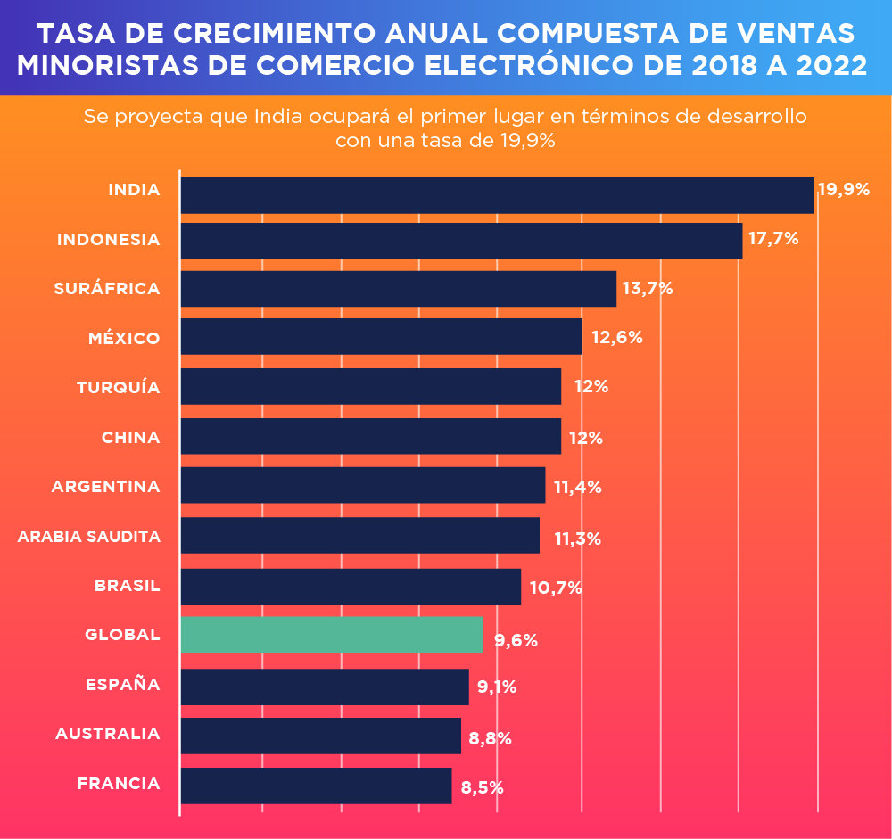 En el gráfico a continuación, podemos observar cómo India es el país con la más alta proyección en el sector minorista de comercio electrónico entre 2018 y 2022: