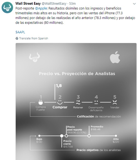 La acción de Apple cayó 1,5% en operaciones posteriores al cierre tras señalar que para el próximo trimestre la compañía generaría entre $60 mil millones y $62 mil millones. Los analistas esperaban $65,7 mil millones.