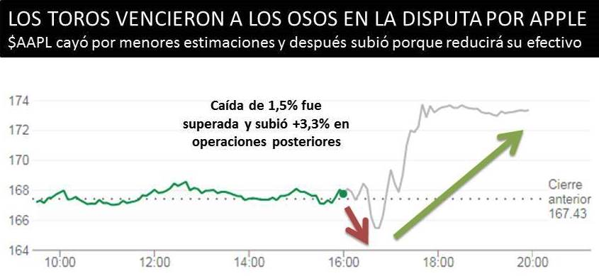 Sin embargo, luego la acción repuntó con la noticia de que Apple reduciría su efectivo neto a cero por el nuevo código tributario de EE.UU., lo que podría representar pagos a los accionistas.