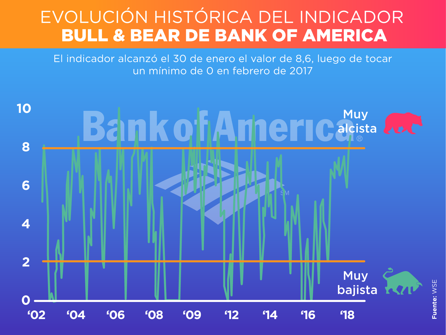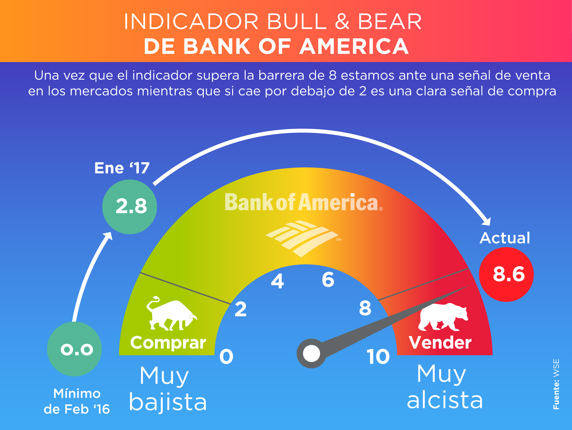 Según confirmó el jefe del departamento de estrategias de inversión del banco, Michael Harnett, el 30 de ese mes el indicador marcó 8,6, la mayor señal de venta en los últimos cinco años. La última vez que estuvo en esos niveles fue en marzo de 2013, cuando el valor se ubicaba alrededor de 10.