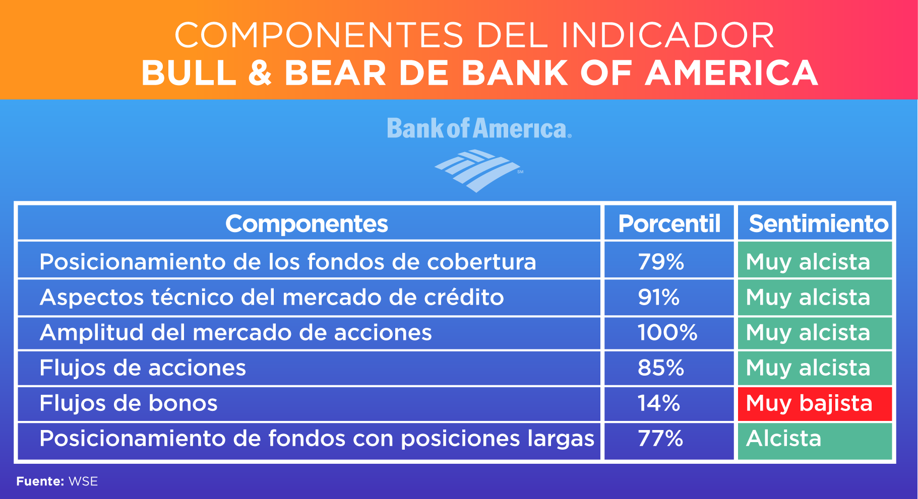 El indicador Bull & Bear se basa en una variedad de factores, como el posicionamiento de los fondos de cobertura, los flujos en bonos y acciones, la amplitud del mercado de acciones y los aspectos técnicos del mercado de crédito. Cada uno de estos componentes se encuentra en un momento de fuerte alza, a excepción de los flujos en el mercado de renta fija, ya que el precio de los bonos ha estado cayendo, lo que trajo como consecuencia una corrección.