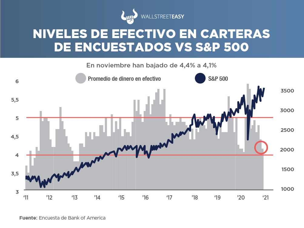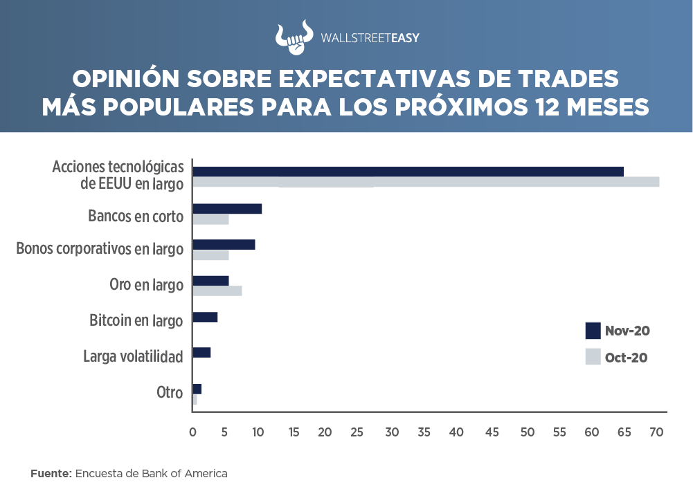 La encuesta se llevó a cabo del 6 al 12 de noviembre, cuando el resultado de las elecciones de EEUU se hizo claro, y Pfizer y BioNTech anunciaron un progreso en su vacuna contra el COVID-19. Los inversores rotaron hacia acciones de valor el 9 de noviembre al ritmo más rápido desde 2008, y las tenencias de efectivo cayeron por debajo de sus niveles anteriores a la pandemia.