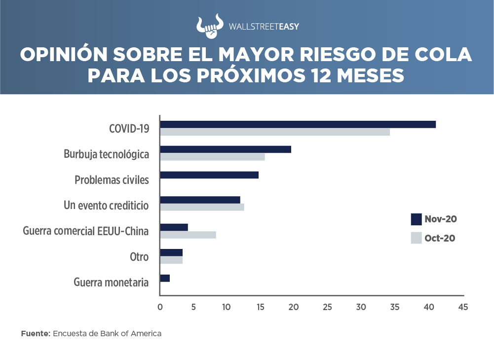 El resurgimiento del coronavirus siguió siendo el mayor riesgo de cola entre los gerentes encuestados, seguido de una posible burbuja tecnológica y disturbios civiles. Los casos de virus han alcanzado niveles récord en EEUU y continúan aumentando. Varias ciudades restablecieron medidas de bloqueo parcial durante la semana pasada para frenar la propagación de la comunidad, reavivando las preocupaciones de una recesión de doble caída.