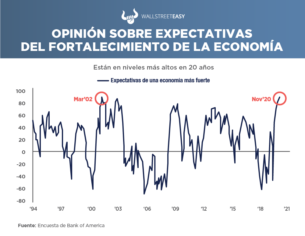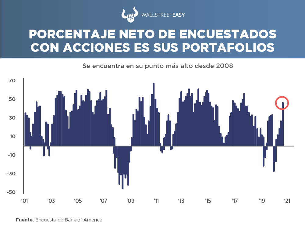 La última encuesta de administradores de fondos del banco encontró que el optimismo de los inversionistas aumentó este mes a su punto más alto desde enero de 2018. Las asignaciones de los administradores a las acciones alcanzaron una sobre ponderación neta del 46%, acercándose poco a poco al umbral del 50% que según Bank of America indica que los sentimientos son extremadamente optimistas.