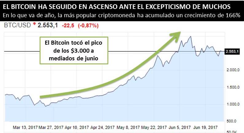 En lo que llevamos de 2017, el precio del Bitcoin ha subido 166%, en medio de lo que algunos analistas llaman una burbuja de las criptomonedas.