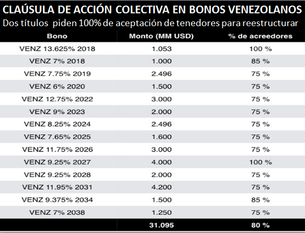 Esa cláusula permite, al lograrse el porcentaje de mayoría acordado, aceptar las condiciones o no cuando un gobierno decide reestructurar. Es vinculante para todos los tenedores y la minoría debe aceptarlo. Aplica solo para la deuda soberana. En la lista de papeles venezolanos solo hay dos sin CAC: