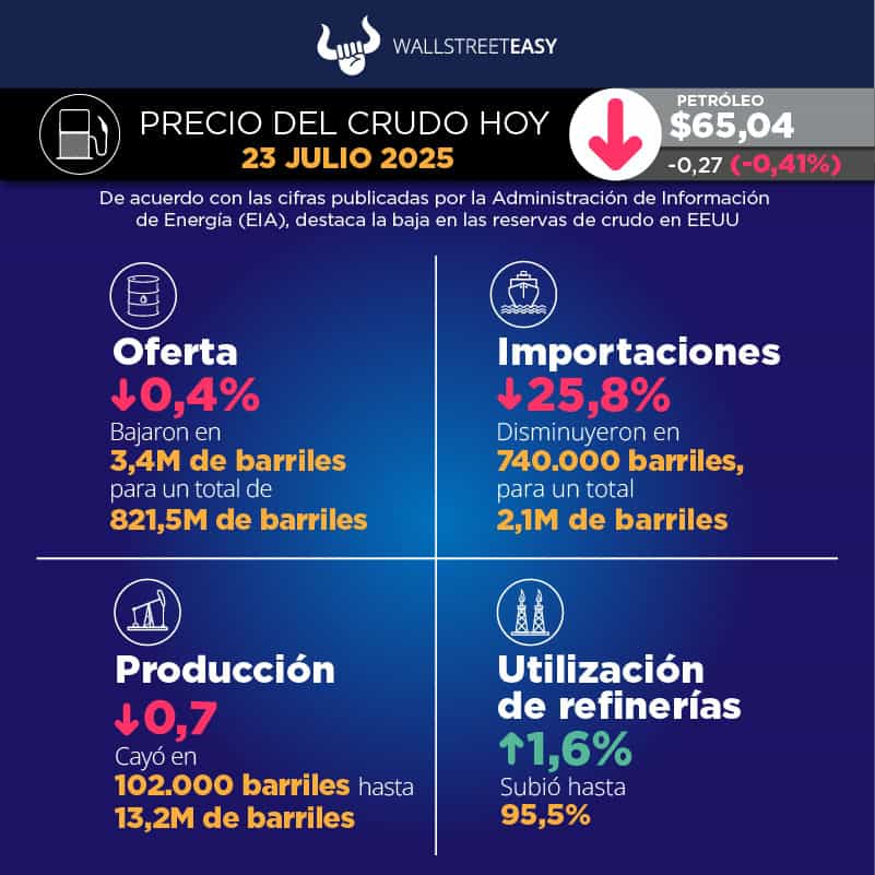 EIA, por sus siglas en inglés) reportó 821,5M de barriles en existencias de crudo, tanto comerciales como estratégicas, lo que representa una baja de 3,4M de barriles. El Instituto Americano del Petróleo (