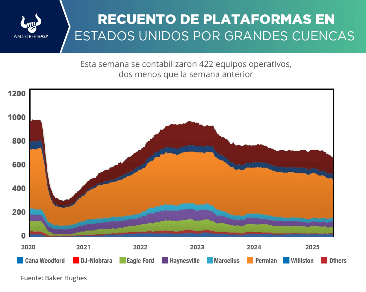 Baker Hughes, actualmente en EEUU se encuentran 544 equipos activos (incluyendo los de gas). En la actividad petrolera se contabilizaron 422, dos menos que la semana anterior. En las operaciones de gas hay 117 equipos operativos, nueve más que hace siete días. Hace un año estaban activas 586 plataformas.