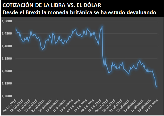 La principal víctima del brexit, hasta ahora, resultó ser la moneda de los británicos. Desde que se aprobó, mediante referendo, la salida de Gran Bretaña de la Unión Europea, la libra esterlina ha perdido –16,5% de su valor y en los primeros 10 días de octubre lleva ya acumulada una caída de –5%. Pero los efectos del brexit, que ya tiene fecha formal de inicio, apenas comienzan a sentirse y permearán a todas las capas de la economía británica.