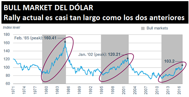El índice dólar (DXY) terminó 2016 en un máximo de 14 años y ha avanzado más de +40%, desde el mínimo alcanzado en abril de 2011, en medio de un mercado alcista.