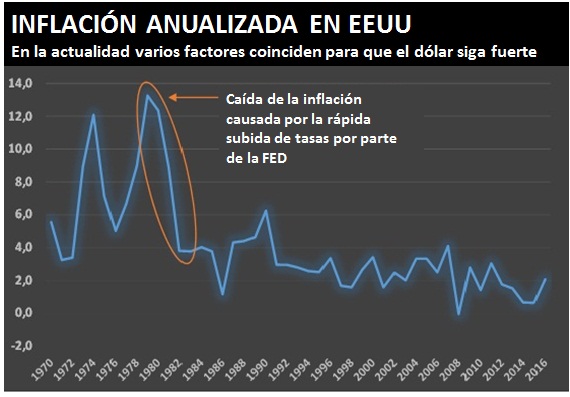 A principio de los años ochenta, la FED subió el costo del dinero para controlar la inflación, lo que se logró en tres años. Estados Unidos comenzó a ofrecer tasas reales muy altas, lo que atrajo capital extranjero y, por ende, fortaleció el dólar.