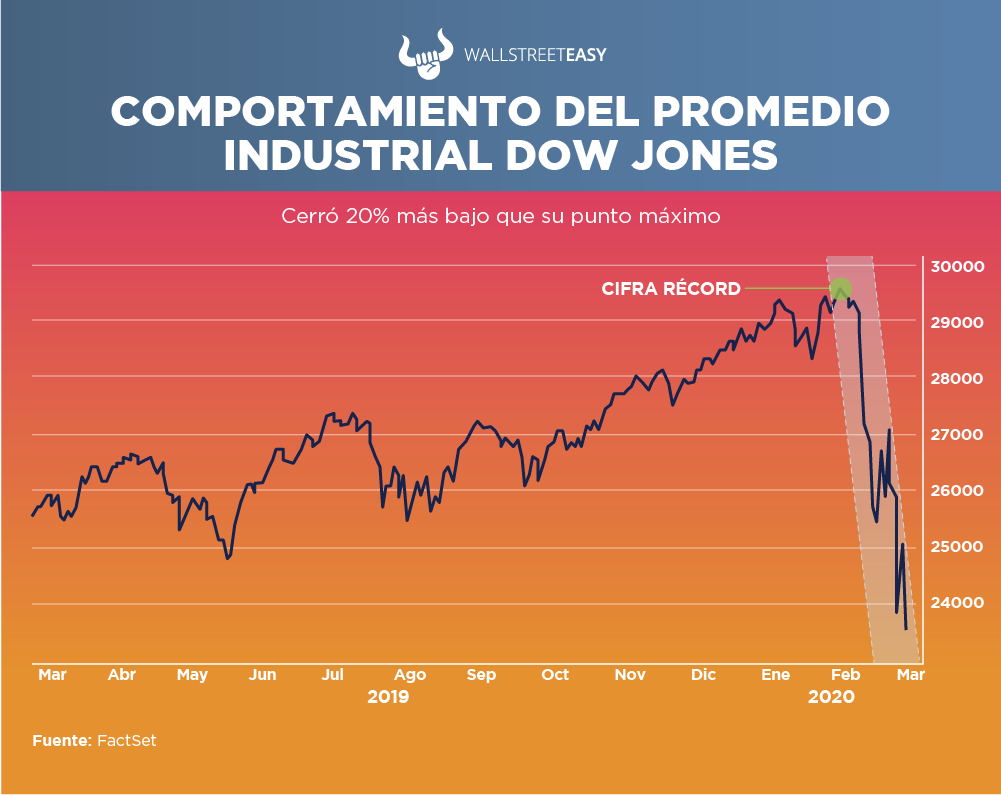Luego de un récord de 11 años, el mercado alcista de Wall Street llegó a su fin el miércoles 11 de marzo, mudándose así a territorio bajista, luego de que el Promedio Industrial Dow Jones cayera –20% desde su máximo histórico.