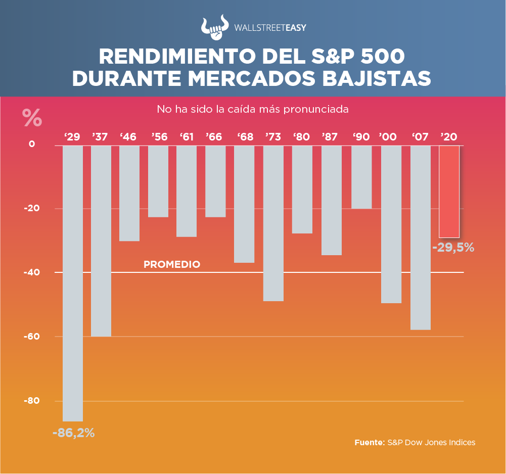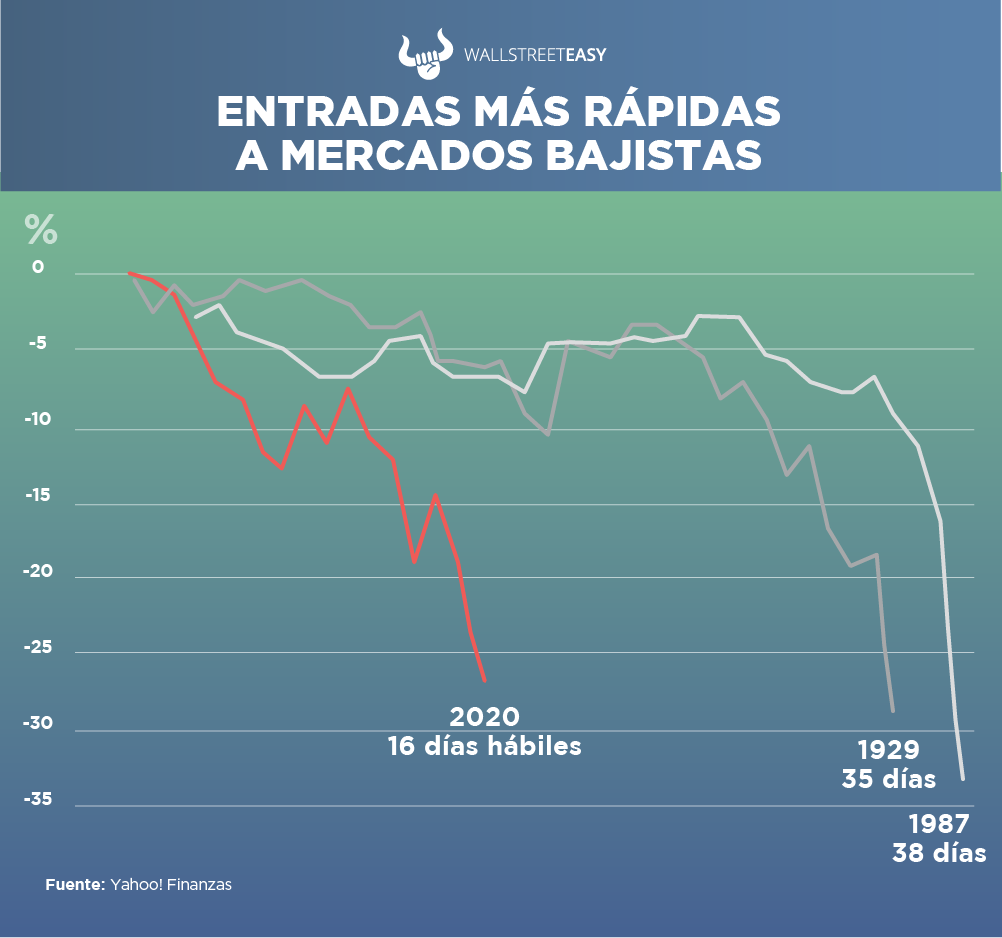 La entrada al mercado bajista fue 10 veces más rápida que el promedio de 164 días de mercados anteriores, siendo las cercanas la de 1929 con la Gran Depresión, y el del crash del Lunes Negro de 1987.