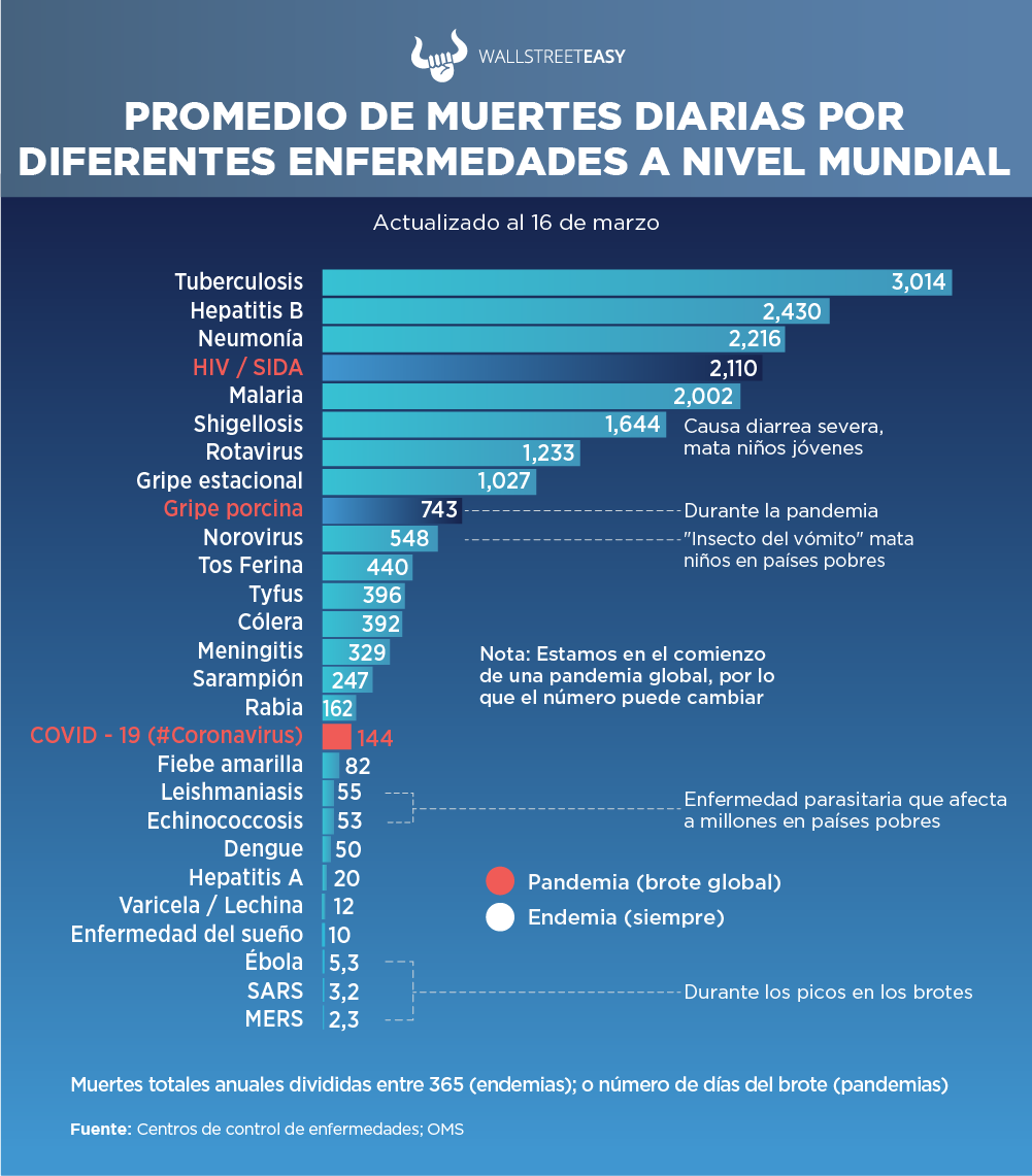 Una de las razones por la que este virus ha generado tanto pánico es debido a lo contagioso, ya que cada persona infectada puede contagiar a 3,5 personas. Sin embargo, la tasa de mortalidad no es alta: de los casos confirmados a nivel mundial, el 3,4% ha muerto, lo que se traduce en 144 muertes por día. En cuanto al período de incubación, según las estadísticas, luego de contagiarse una persona puede tardar hasta 12 días en presentar síntomas.
