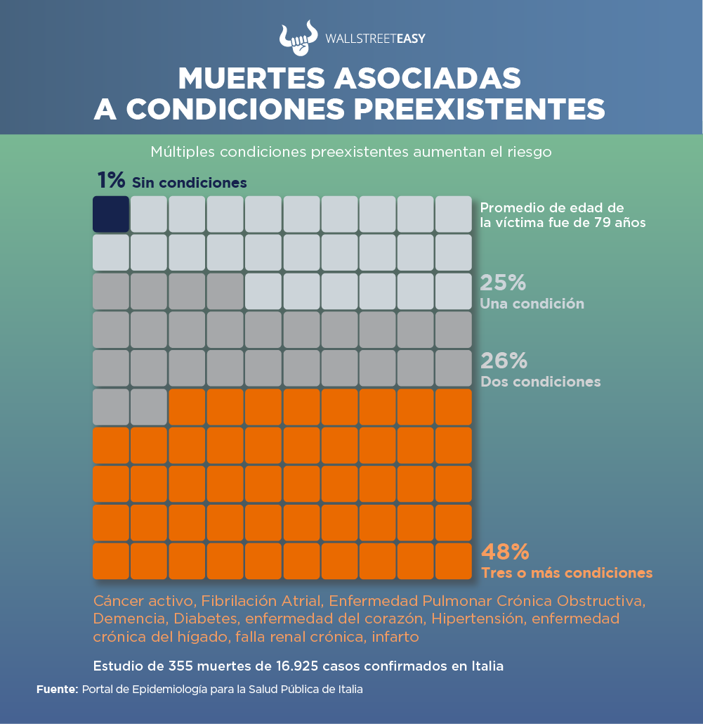 En cuanto al riesgo que tiene la enfermedad, las personas de más de 60 años y en especial los que tienen alguna enfermedad o condición preexistente, como enfermedades cardiovasculares o diabetes, son las que presentan más riesgo. Si la persona tiene más de una enfermedad preexistente el riesgo aumenta.