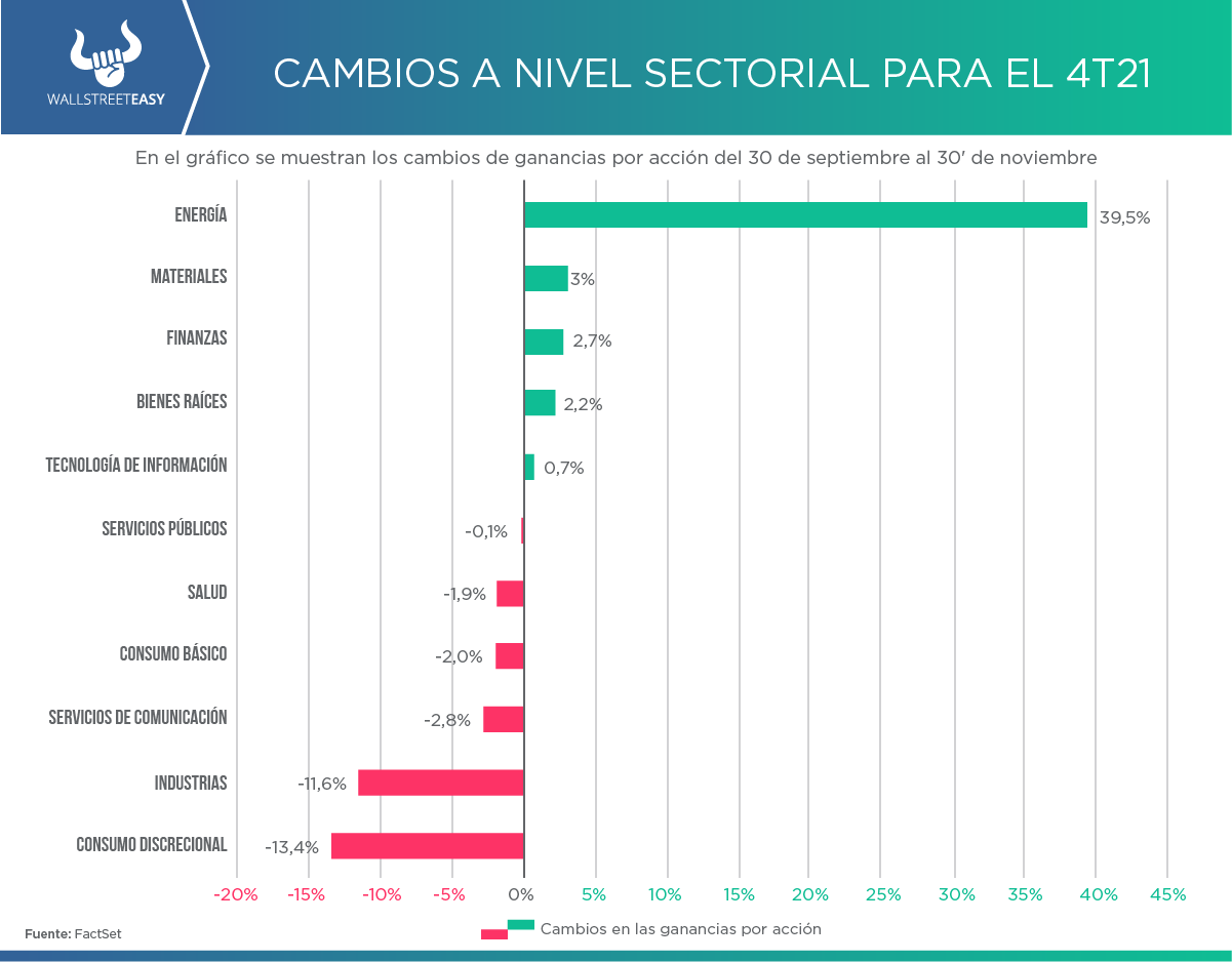 A nivel sectorial, seis sectores registraron una disminución en sus estimaciones de ganancias por acción para el 4T21 durante los dos primeros meses del trimestre, liderados por consumo discrecional (–13,4%) e industrial (–11,6%).
