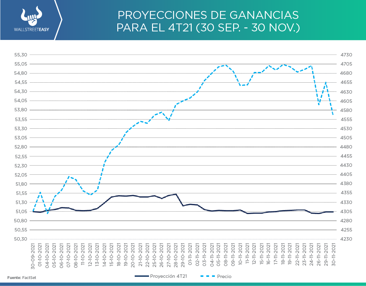A medida que la proyección de ganancias por acción del índice disminuyó durante los dos primeros meses del trimestre, el valor del S&P 500 aumentó durante este mismo período. Desde el 30 de septiembre hasta el 30 de noviembre, el valor del índice aumentó +6% (de 4.307,54 a 4.567).