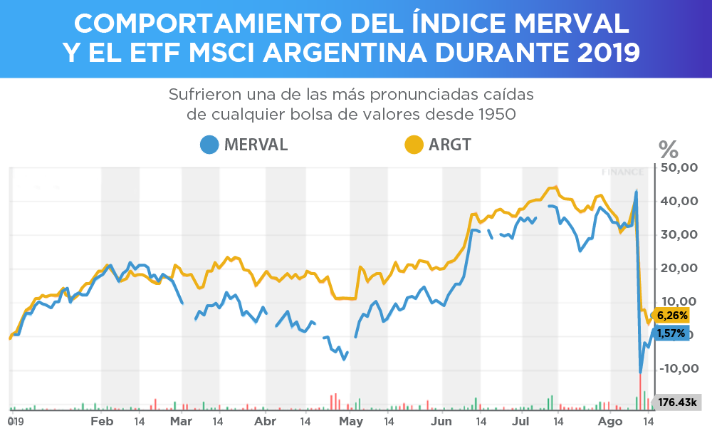 El índice de referencia argentino MERVAL (MERV) cayó el lunes –38% (ubicándose entre las caídas más grandes de cualquier bolsa de valores desde 1950, según datos de Bloomberg); mientras que el ETF Global X MSCI Argentina se desplomó –25%. El Merval luego recuperó algunas de las pérdidas en los días siguientes.