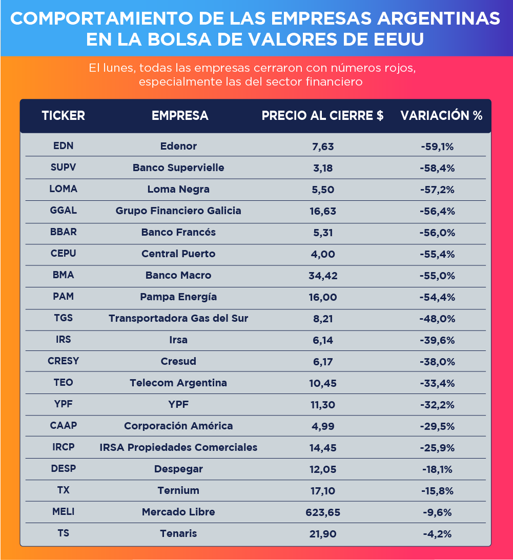 Todas las empresas argentinas que cotizan en Wall Street cerraron en rojo la jornada del lunes, con caídas que llegaron a superar el –50%. En general, las acciones del sector financiero fueron las que presentaron las caídas más elevadas, mientras que Tenaris (TS) y MercadoLibre (MELI), fueron las que cayeron menos, dado que sus ingresos tienen una baja exposición al mercado argentino.