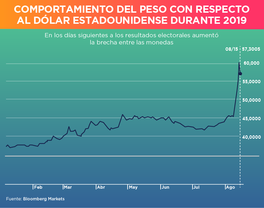 Por otro lado, el peso argentino también se desplomó, cayendo –15%, tendencia que prosiguió los siguientes dos días. Para el miércoles, el peso se cotizaba a 60,2425 por dólar americano; sin embargo, la moneda se fortaleció un poco el jueves, tras los mensajes conciliadores entre Fernández y Macri, donde llamaban a la calma a los mercados.
