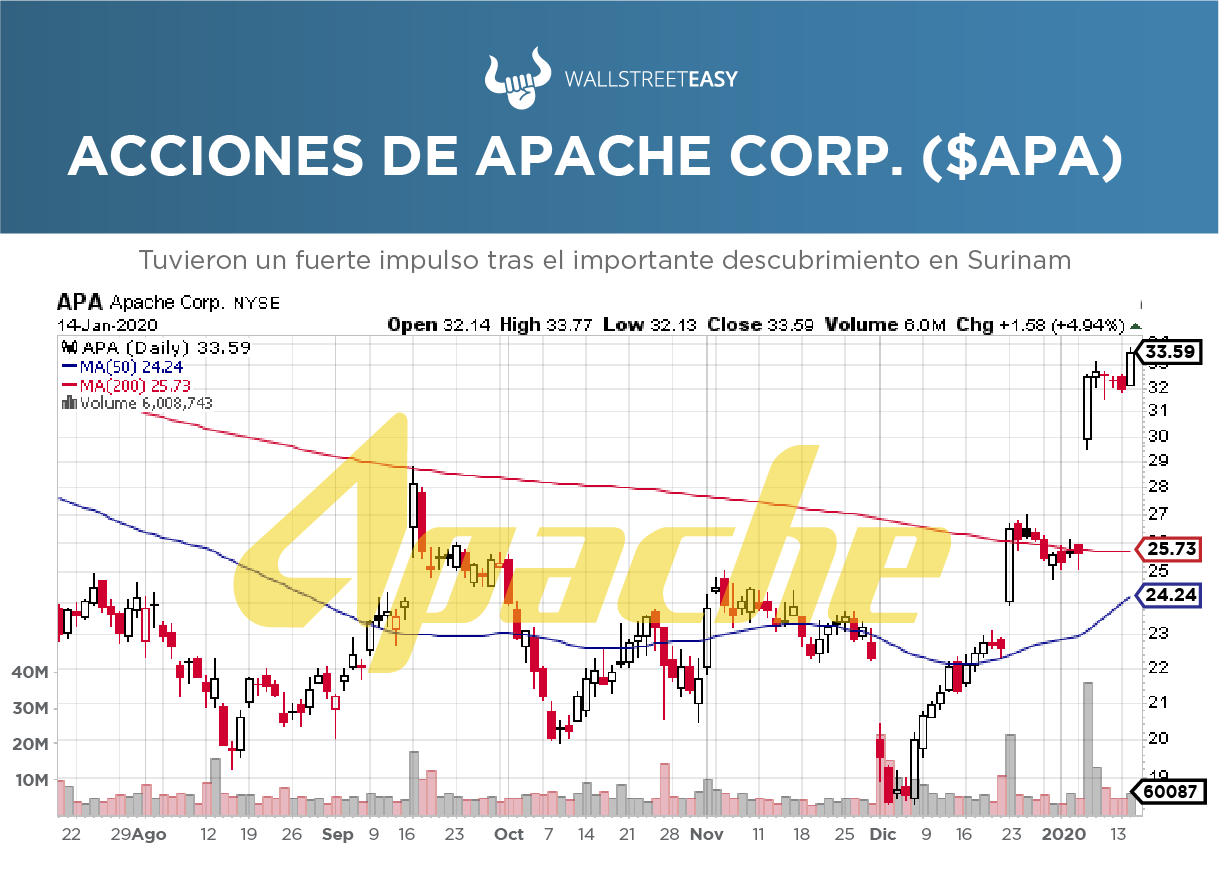 Las acciones de la empresa estadounidense Apache Corporation (APA) obtuvieron su mayor ganancia desde 1973, luego de que junto con su socio Total S.A (TOT), anunciaran un importante descubrimiento en el bloque 58 de Surinam.