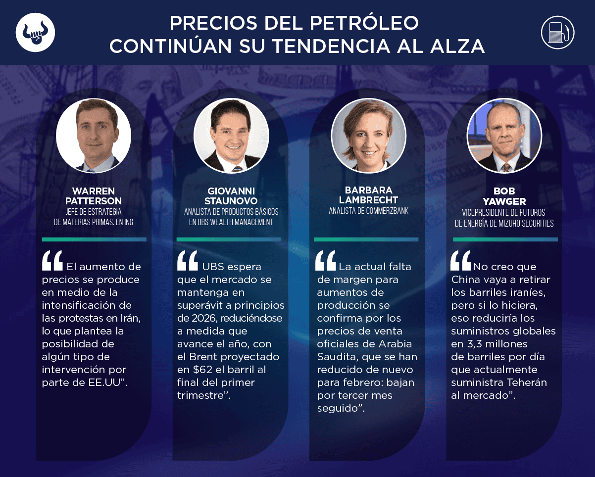 Los disturbios sociales en Irán, el arancel adicional del 25% impuesto por Trump a los compradores de crudo iraní, la confusión sobre las exportaciones de petróleo de Venezuela y los repetidos ataques a petroleros en el mar Negro han provocado una impresionante recuperación de los precios del petróleo, con el ICE Brent recuperándose hasta los $65 por barril: