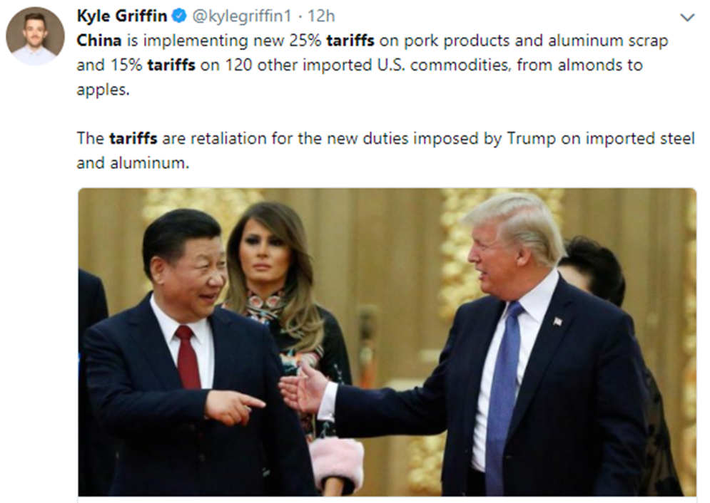 El domingo 01 de Abril el Ministerio de Finanzas chino anunció la imposición de aranceles comerciales a 128 artículos procedentes del país norteamericano, con 15% a la importación de frutas y otros productos básicos, y 25% sobre la carne de cerdo y sus derivados.