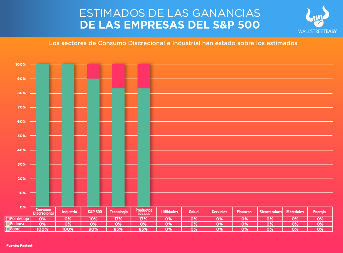 De las 20 empresas que han reportado, el 90% ha superado las estimaciones de ganancias por acción y el promedio de cinco años. A nivel sectorial, Consumo Discrecional e Industrial tienen los porcentajes más altos de las que reportaron ganancias por encima de las estimaciones, con 100%; mientras que Consumo Básico y Tecnología de la Información, ambos con 83%, son los sectores con los porcentajes más bajos.