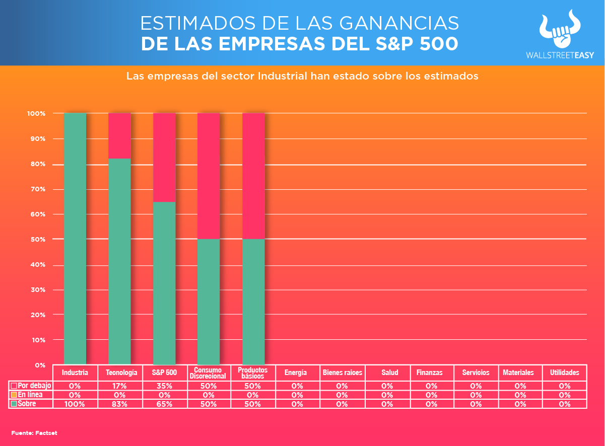 En términos de ingresos, el 65% de las empresas ha reportado ventas reales por encima de las ventas estimadas. Los sectores Industrial (100%) y Tecnología de la información (83%) tienen los porcentajes más altos por encima de las estimaciones; mientras que Consumo Discrecional (50%) y Consumo Básico (50%), tienen los porcentajes más bajos.