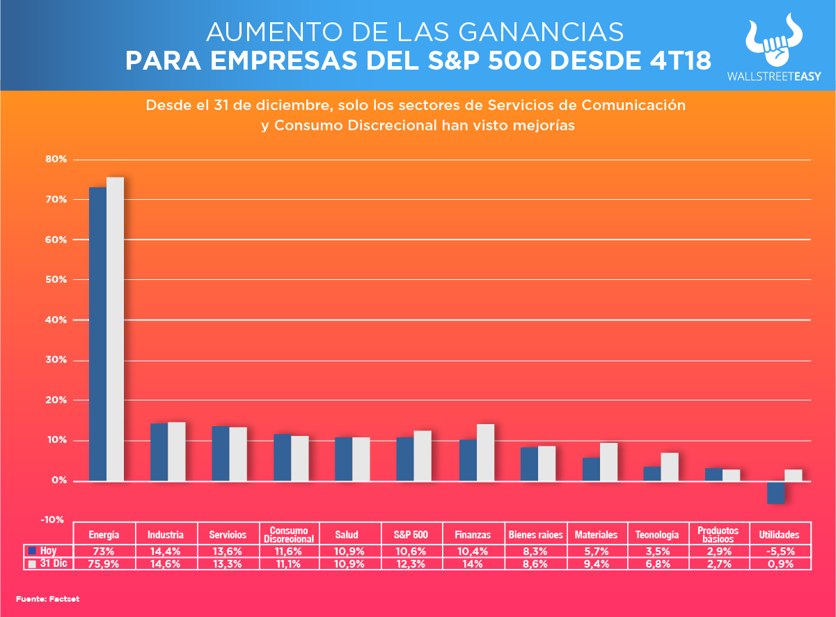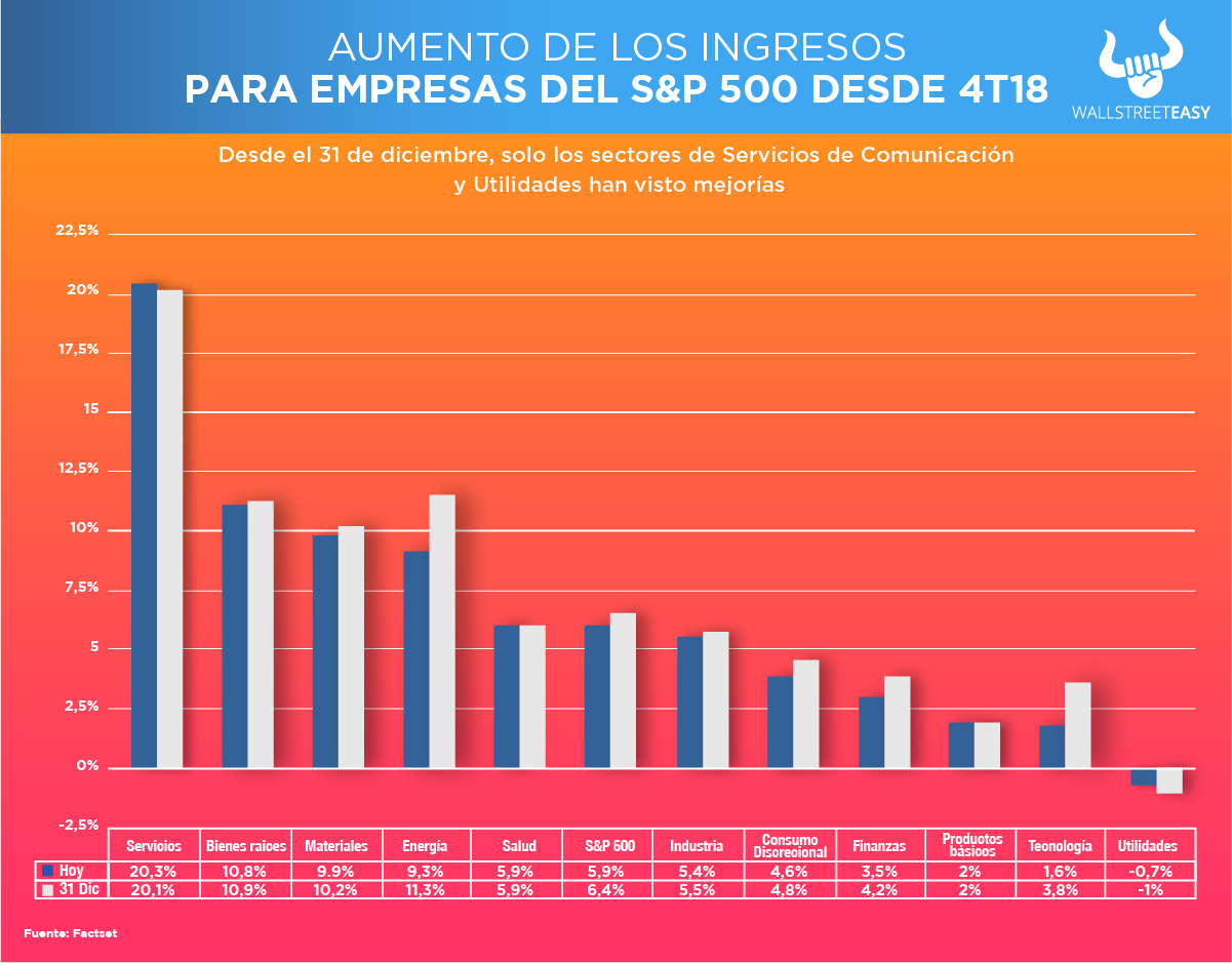 Dos sectores han registrado un aumento en el crecimiento de ingresos desde el final del 4T18, debido a revisiones al alza de estimaciones de ingresos, liderados por Utilidades (de –1% a –0,7%). Siete sectores han registrado una disminución, como Tecnología de la Información (de 3,8% a 1,6%) y Energía (11,3% a 9,3%).