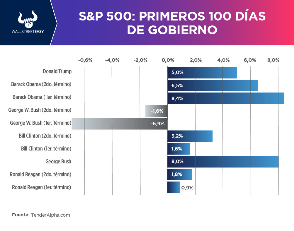 El S&P 500 ha subido en los primero 100 días calendario en ocho de los últimos 10 mandatos presidenciales, pero también ha aumentado en ese período aproximadamente el 75% del tiempo en los últimos 40 años, independientemente de si un nuevo presidente acaba de ser investido.