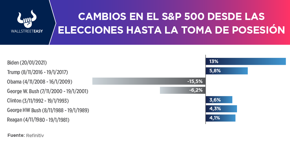 El actual aumento del mercado representa la segunda vez consecutiva que Wall Street ha aplaudido a un nuevo presidente: las acciones ganaron más del +6% en la elección al período de toma de posesión, después de que Donald Trump venció a Hillary Clinton en 2016. Sin embargo, hay una diferencia importante, Trump heredaba una economía que crecía a ritmo estable durante la larga recuperación posterior a la Gran Recesión. Biden está entrando en la economía del COVID-19.