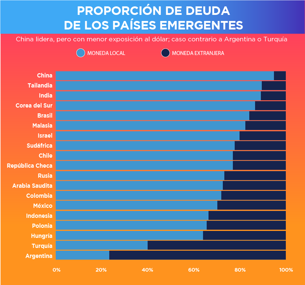 China posee el 90% de su deuda en moneda local, mientras que otros mercados emergentes tienen más de la mitad de su deuda en moneda extranjera. Los que tienen la mayor porción de deuda en esta última son: Argentina (alrededor del 20%) y Turquía (alrededor del 40%), por lo que no es de extrañar que, con la fortaleza del dólar en 2018, ambos países pasaran dificultades, sobre todo con sus monedas devaluándose.