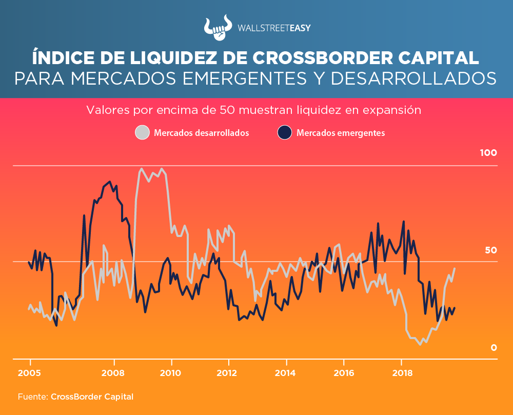 CrossBorder Capital, firma de asesoría de inversiones con sede en Londres, mantiene índices de liquidez global, cubriendo bancos centrales, flujos financieros internacionales y liquidez del sector privado nacional. Valores por encima de 50 muestran expansión, mientras que un número creciente muestra aceleración.