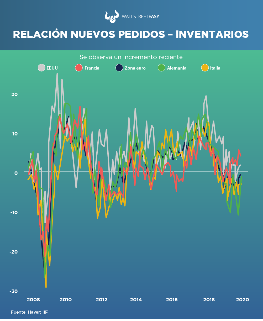 Según se observa en el siguiente gráfico del Instituto Internacional de Finanzas, los nuevos pedidos en relación a los inventarios han ido en aumento en todo el mundo, siendo Francia el que más sobresale.