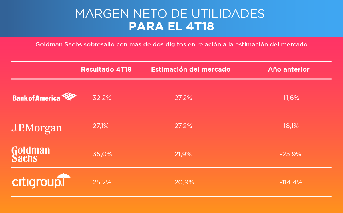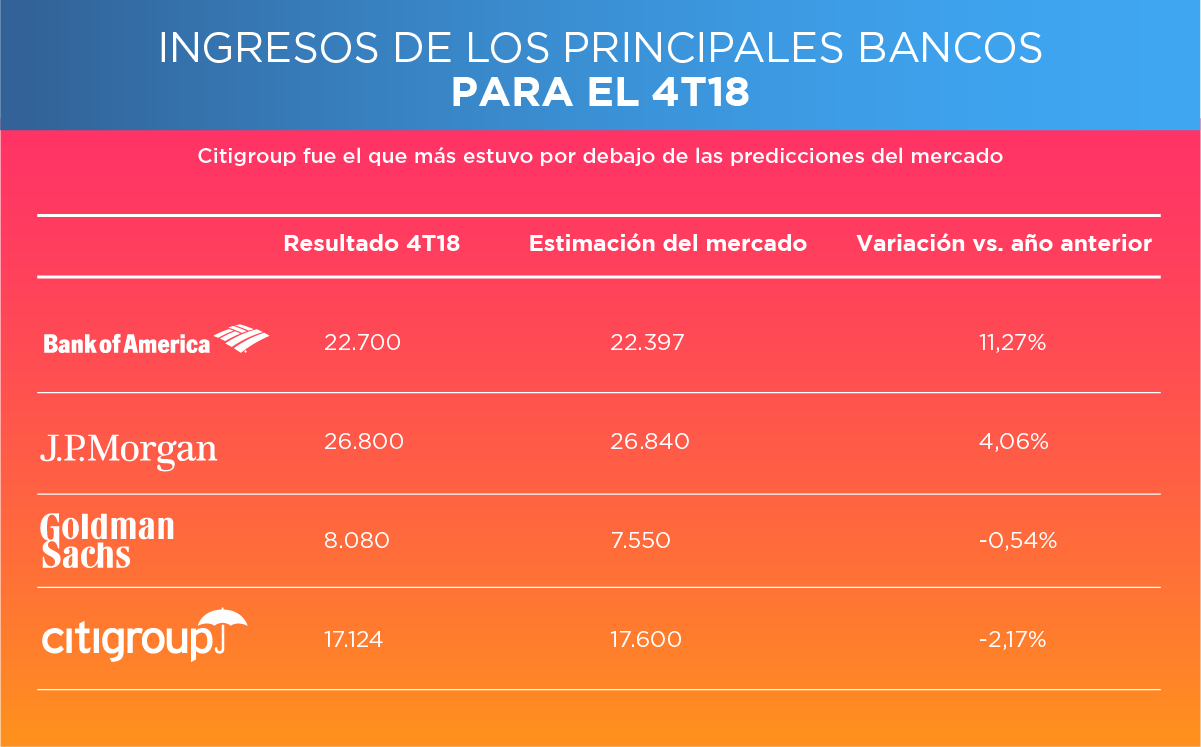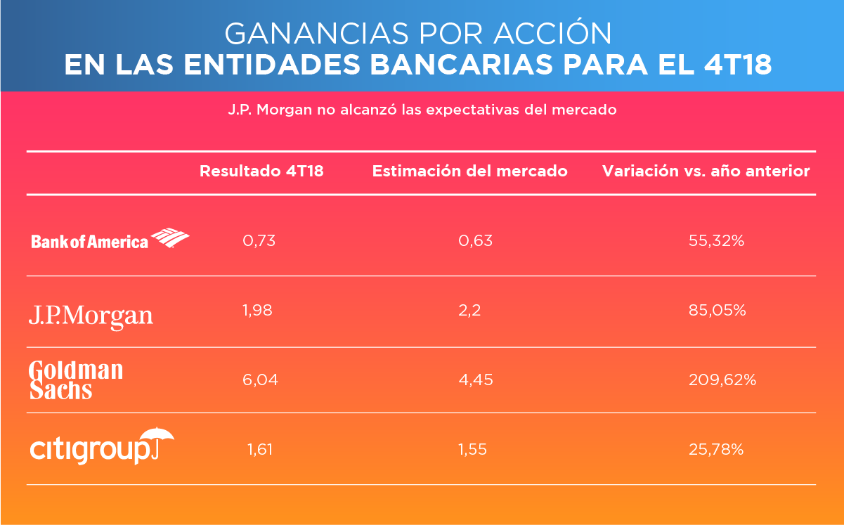 Algunas empresas del sector bancario han mostrado sus números para el 4T18. Veamos qué tienen que decir Bank of America (BAC), Citigroup (C), Goldman Sachs Group (GS) y JP Morgan Chase & Co (JPM).
