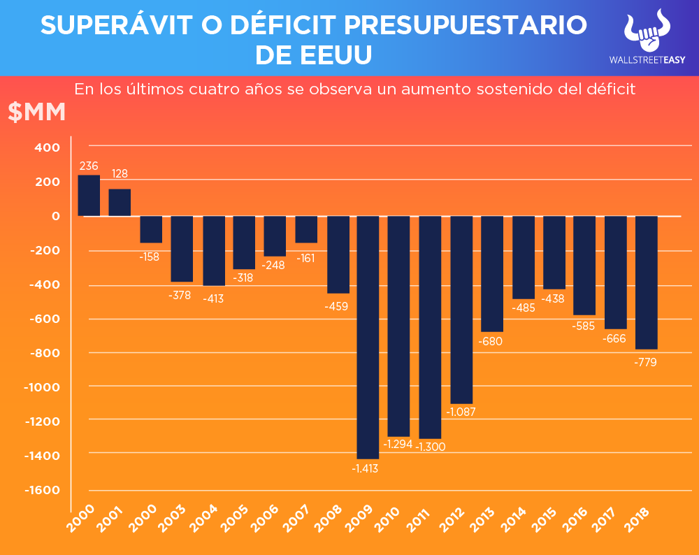 Según publicó el ente gubernamental, el déficit presupuestario de EEUU se ubicó en $779.000M para el período comprendido entre octubre de 2017 y septiembre de 2018, lo que se traduce en un incremento de 17% en comparación al año anterior, marcando así su tercera subida consecutiva y, además, el nivel más alto desde 2012.
