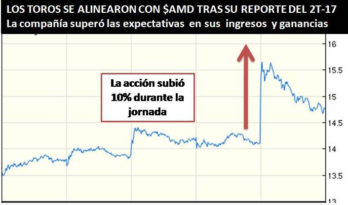 El miércoles 26 de julio, las acciones de Advanced Micro Devices, Inc ($AMD) subieron 10% tras superar las expectativas en su reporte del 2T-17.