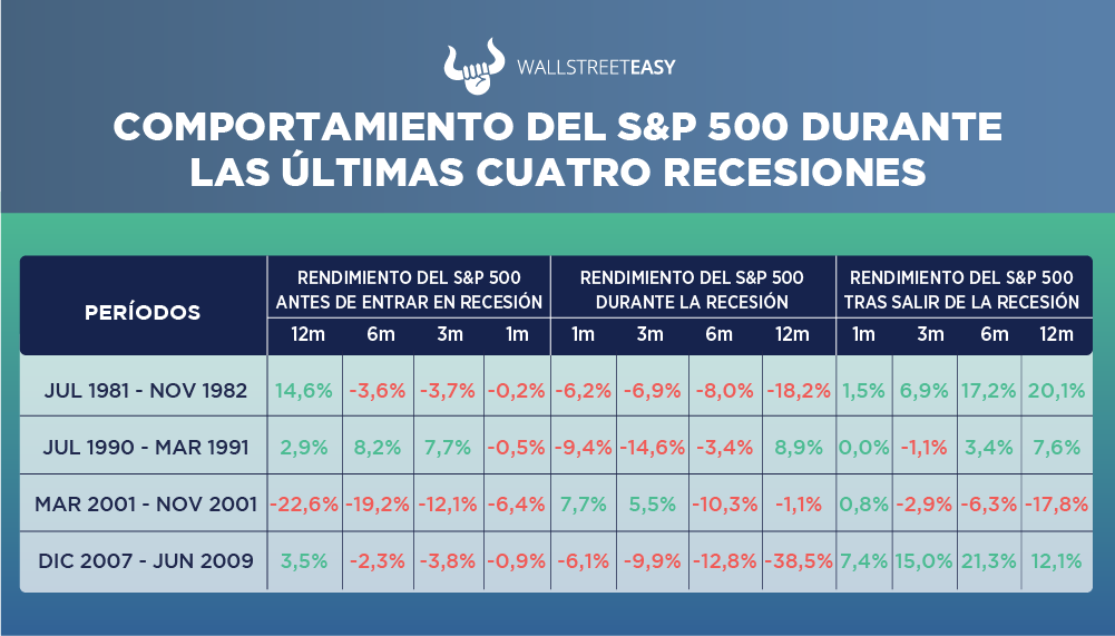 Con una posible recesión sobre la mesa, es importante observar cómo se ha comportado el mercado accionario en recesiones anteriores. Estudiando las cuatro últimas se puede deducir que antes de entrar en la misma comienzan a haber caídas en la bolsa de valores, que se pueden hacer más pronunciadas, pero una vez terminado el período de recesión, el mercado accionario comienza a repuntar.