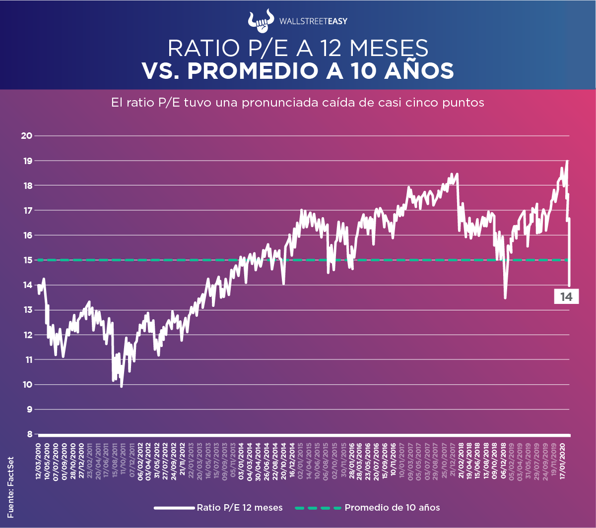 El ratio P/E del índice S&P 500 cae por debajo del promedio de 10 años.